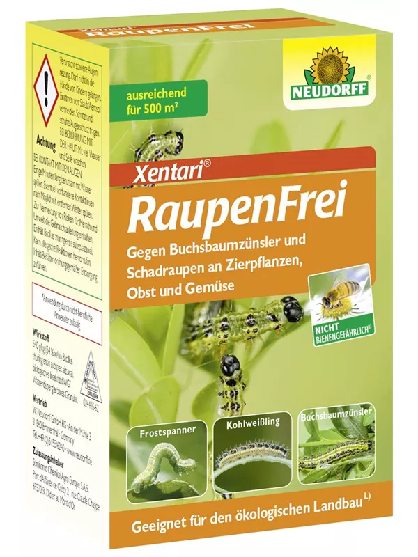 Biologisches Spritzpulver zur Bekämpfung von Schadraupen an Zierpflanzen, Obst, Gemüse und Weinreben. Wirkt ganz gezielt gegen verschiedene Schmetterlingsraupen wie z.B. Buchsbaumzünsler, Frostspanner und Kohlweißlinge. Natürlicher Wirkstoff. Schonend für Bienen (NB 6641) und andere Nützlinge. Geeignet für den ökologischen Landbau gemäß der Verordnung (EG) Nr. 834/2007.