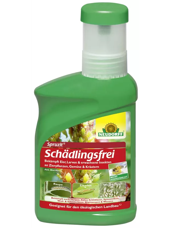 Spritzmittel mit breitem Wirkungsspektrum gegen saugende Insekten an Zierpflanzen,Gemüse und Kräutern. Durch die Kombination der natürlichen Wirkstoffe Natur-Pyrethrum und Rapsöl werden nicht nur ausgewachsene Insekten, sondern auch deren Eier sicher bekämpft. Nebenwirkungen auch gegen Raupen, Blattwespen- und Käferlarven. Nicht bienengefährlich (NB 6641). Geeignet für den ökologischen Landbau gemäß der Verordnung (EG) Nr. 834/2007.