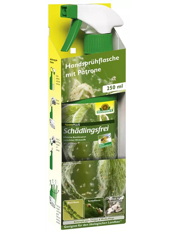 Anwendungsfertiges Kontakt- und Fraßinsektizid zur Bekämpfung von Blattläusen, Schildläusen, Woll- und Schmierläusen, Spinnmilben, Thripsen und Weißen Fliegen an Zierpflanzen. Enthält die natürlichen Wirkstoffe Neem und Rapsöl. Rapsöl bekämpft die ausgewachsenen Insekten, Neem verhindert die Weiterentwicklung von Ei- und Larvenstadien der Schädlinge. Nicht bienengefährlich (NB 6641) und gut pflanzenverträglich. Geeignet für den ökologischen Landbau gemäß der Verordnung (EG) Nr. 834/2007.